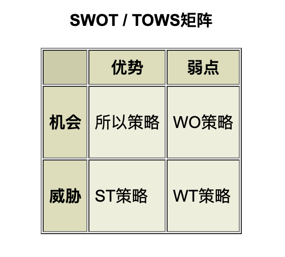 为了制定考虑 SWOT概況的战略,可以构建这些因素的矩阵。SWOT 矩阵(也称为TOWS 矩阵)如下所示: