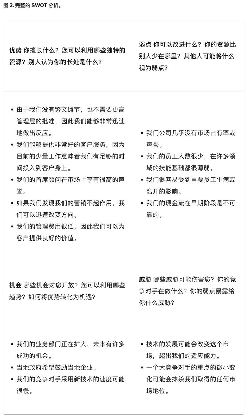 想象一下这种情况:一家小型初创咨询公司希望清楚地了解其当前状况,以决定未来的增长战略。该团队收集并制定了图 2 中所示的 SWOT 分析。
