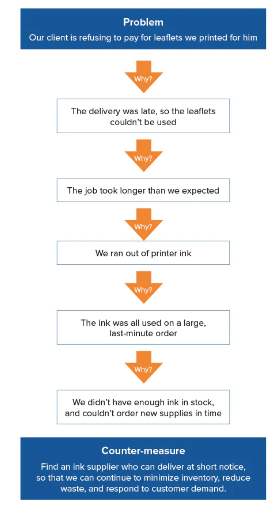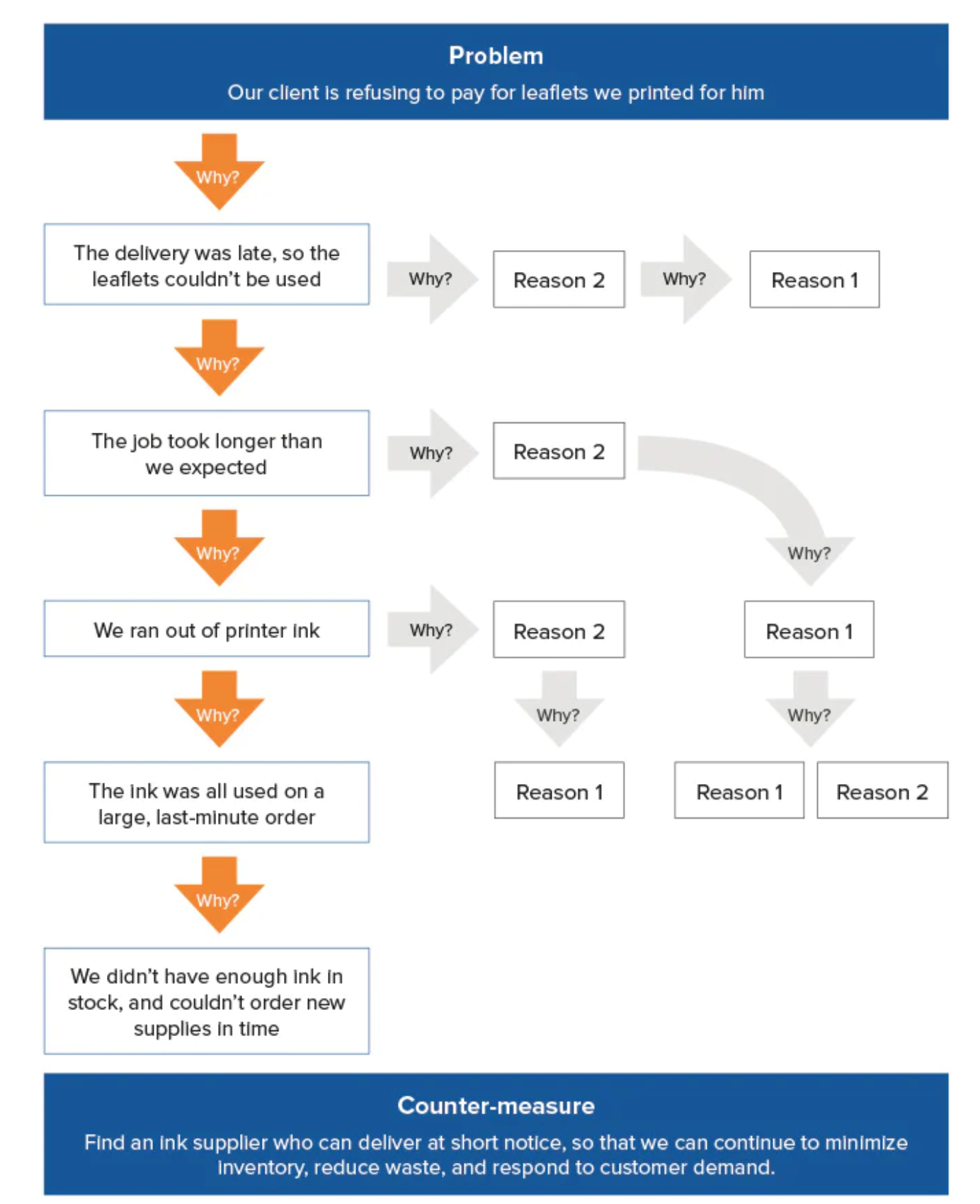 “为什么我们用完了打印机墨水”(原因 2)还有第二个原因,下一个“为什么?”的答案只有一个。(原因 1),然后可以通过对策解决。