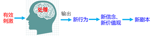首先得到有效的刺激,让我们看到原有信念、价值观对自身的限制,经过思考形成新的想法和观念,并在新的想法和观念指导下付之实践(即产生新行为),通过新的行为(经历)的积累又形成新的信念、价值观。