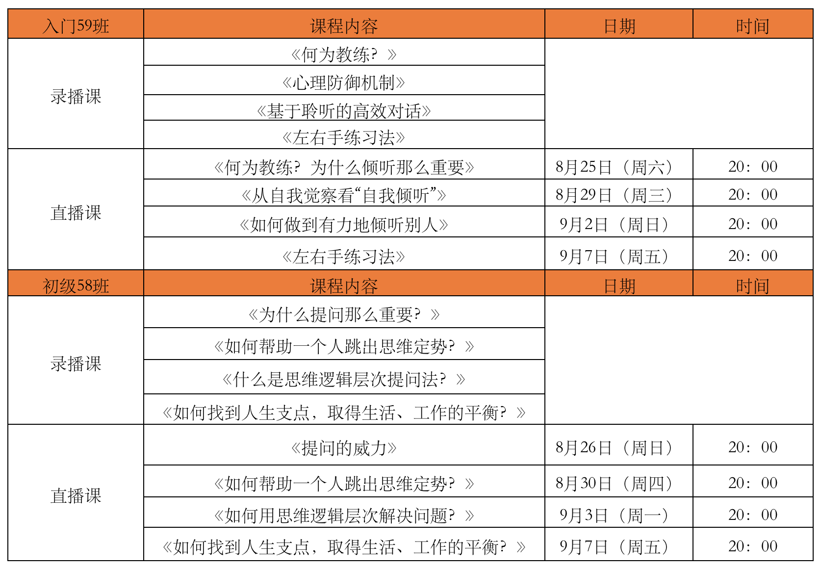 2018年9月入门、初级班课程时间安排表