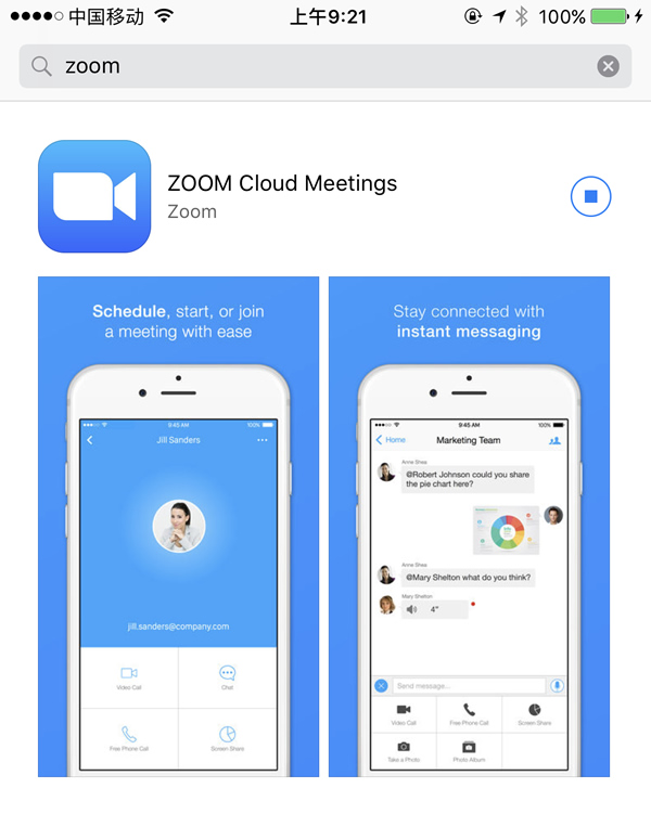 iphone、ipad请登陆app store(手机下载商店),搜索Zoom即可以看到Zoom软件(如下图),会看到以下图片(ZOOM Cloud Meetings)点击下载