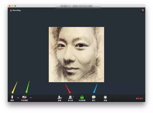 黄色箭头的按钮是“静音”,绿色剪头的按钮是“关闭视频(或打开)”,红色剪头的按钮是可以看“参与者”,蓝色剪头的按钮是“聊天记录”。