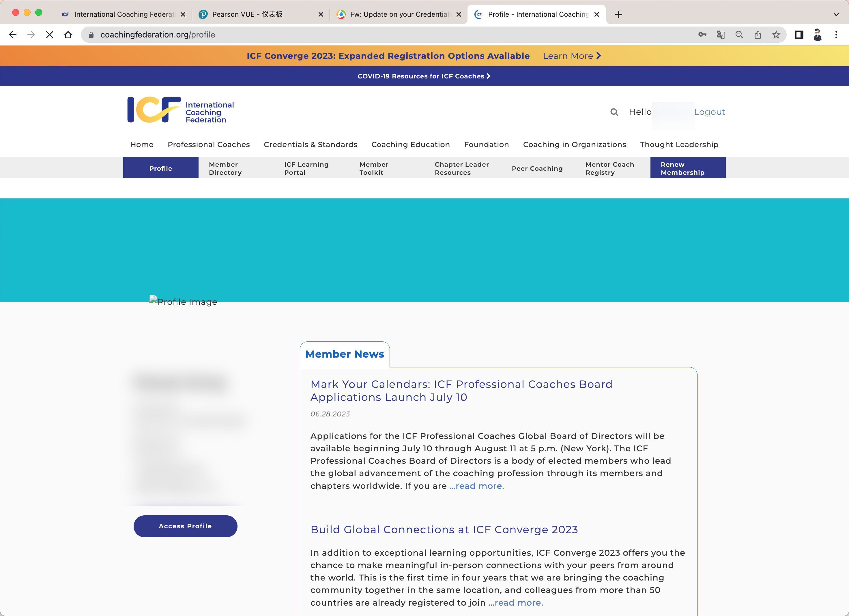 接下来,进入ICF会员页,点右上角自己的名字,然后进入下面的界面,点击左下角蓝色按钮 ”Access Profle“ 进入(图后会继续详细说明步骤)
