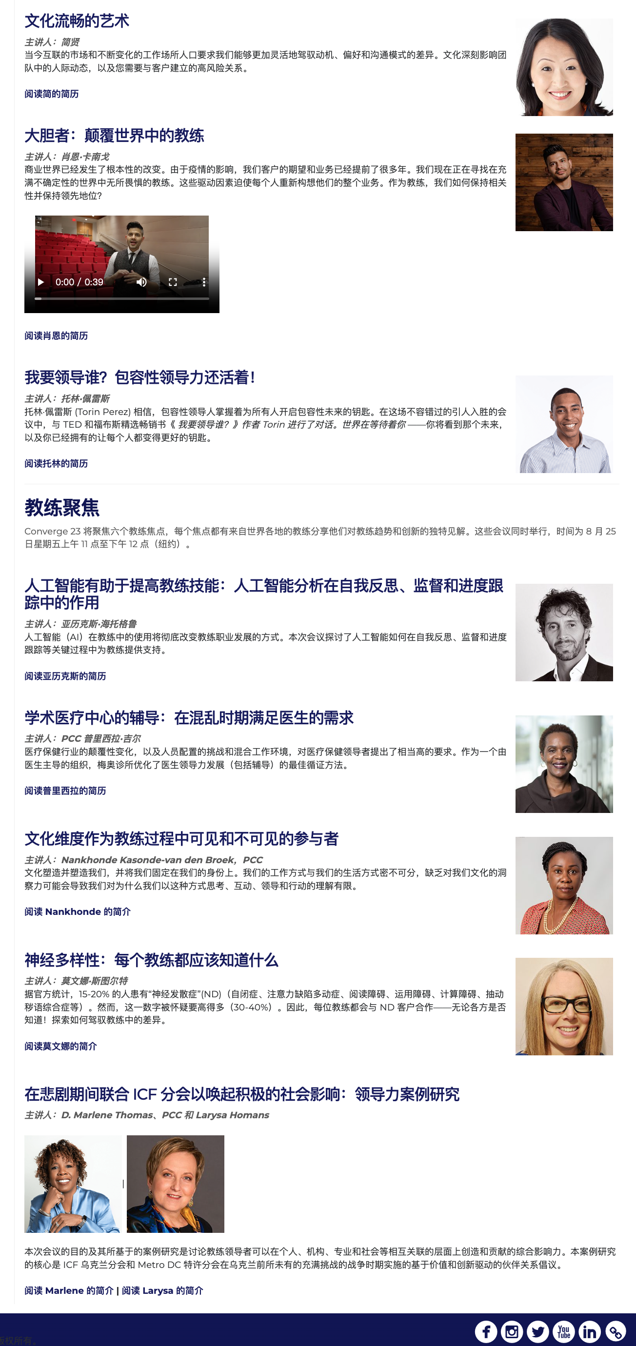 我们的 标志性演讲 将展示作者对影响教练界的广泛主题的观点,包括真实的领导力、教练文化、文化流畅性、颠覆性、包容性领导力和有意义的联系。