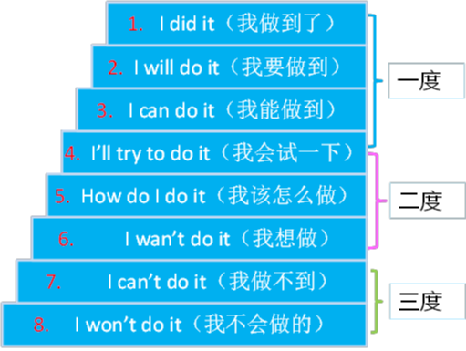相反,如果处在“我要做到”的位置时,有非常强烈的要做到的愿望,就会想尽办法、寻找一切资源、克服所有困难实现目标。