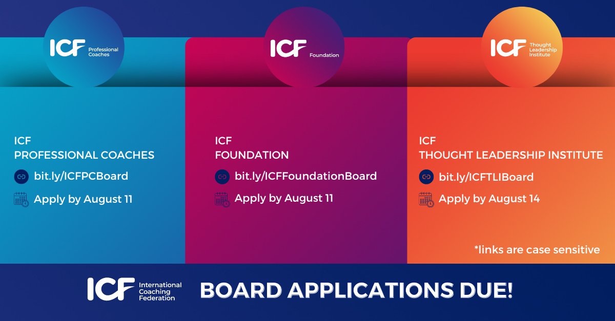 如果您有兴趣帮助 ICF 推进我们的愿景和使命,请不要错过这个贡献的机会。这也是扩展您的领导能力并与全球同行合作的绝佳机会。