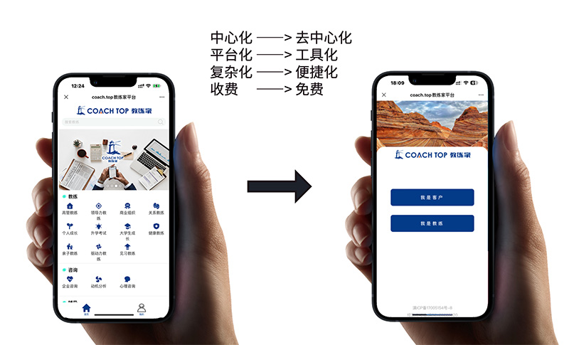 原来的教练家是一个中心化的交易平台,上面有教练的服务介绍和下单功能。但我们发现,这个功能的利用率不高,投入的成本却很大。现在,我们把它“去中心化”,转型成一个工具平台。教练可以用它展示自己、与客户互动,而不是直接在平台上完成交易。 -