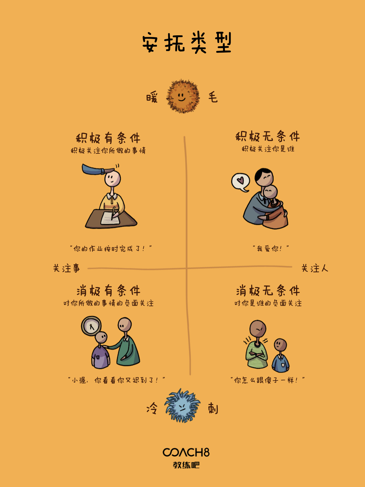 安抚可以是积极的(例如“你很帅”)或消极的(例如“你的发型看起来不好看”)。积极的安抚会带来“我很好”的感觉。消极的安抚会带来“我不好”的感觉。然而,由接收者决定安抚的体验是积极的还是消极的。