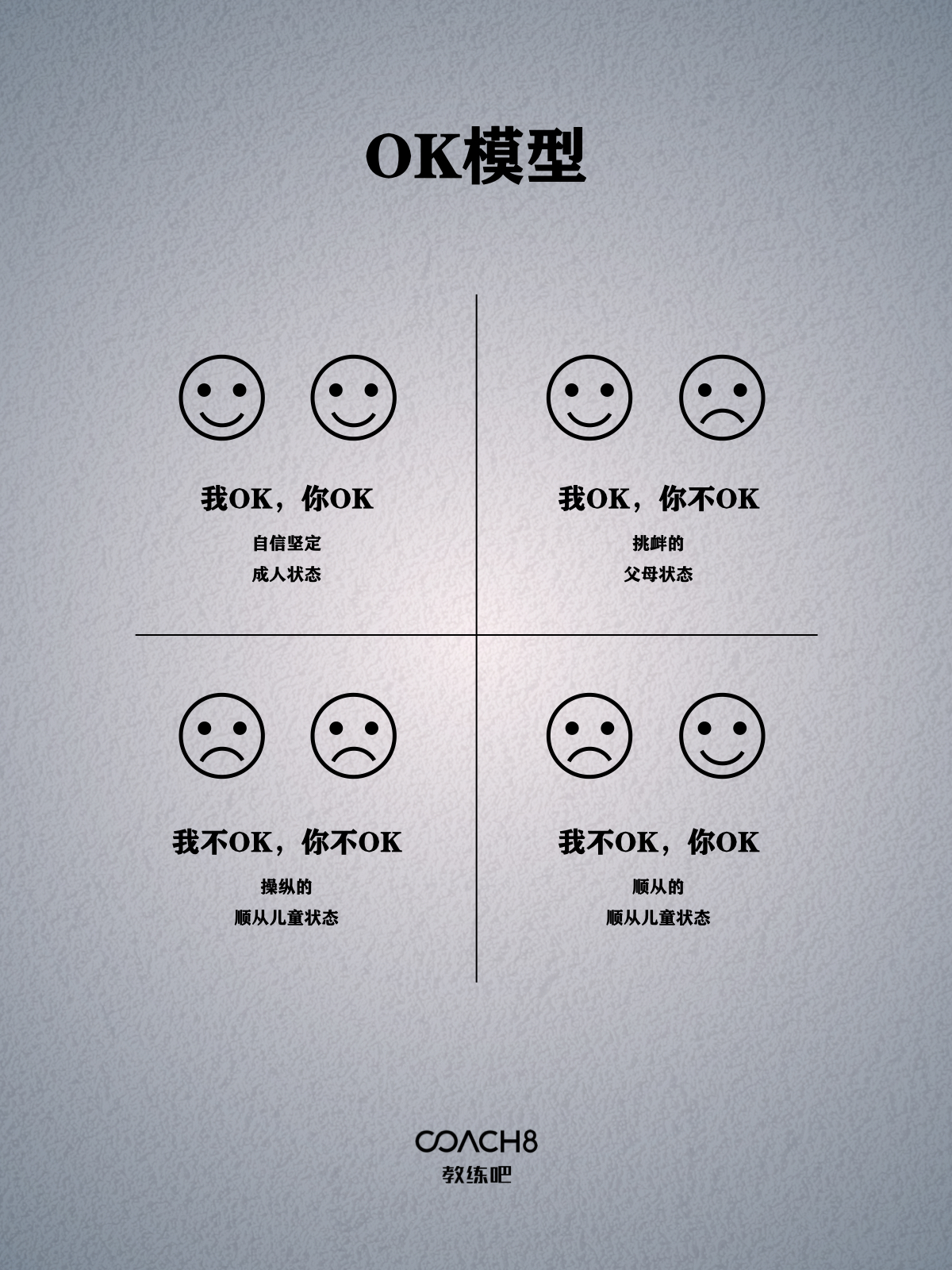 OK模型,又称Four Life Positions(心理地位)是心理学中的概念,用于描述人们对自己、他人和世界的态度和信念。这四种心理地位是: