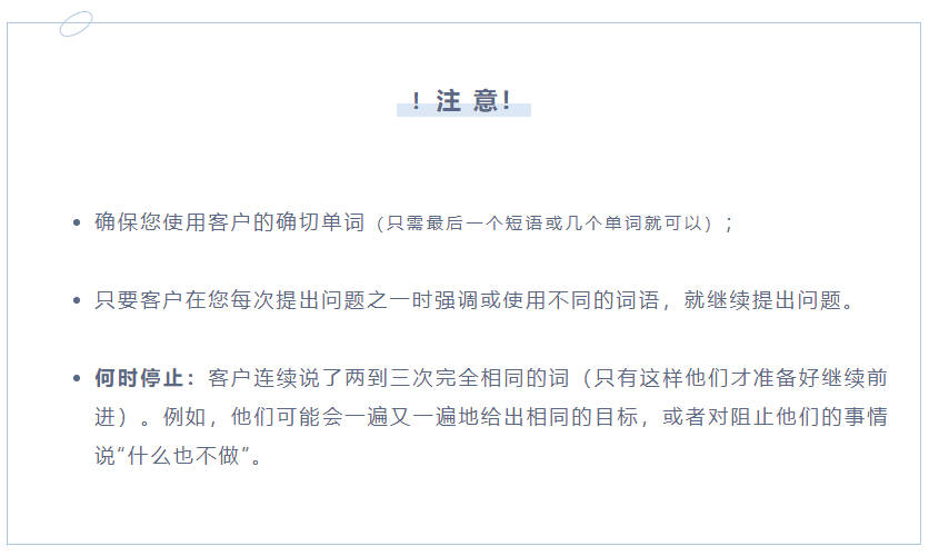 在获得客户许可的情况下(即假设他们也想探索和了解是什么阻碍了他们),尝试这个强有力的提问过程,将有助于发现客户限制或阻碍自己的地方。