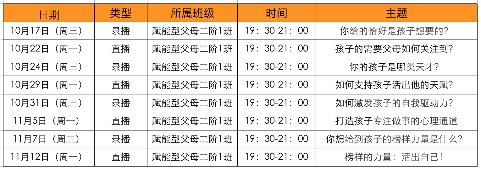 2018年10月《赋能父母二阶段》课程时间安排表