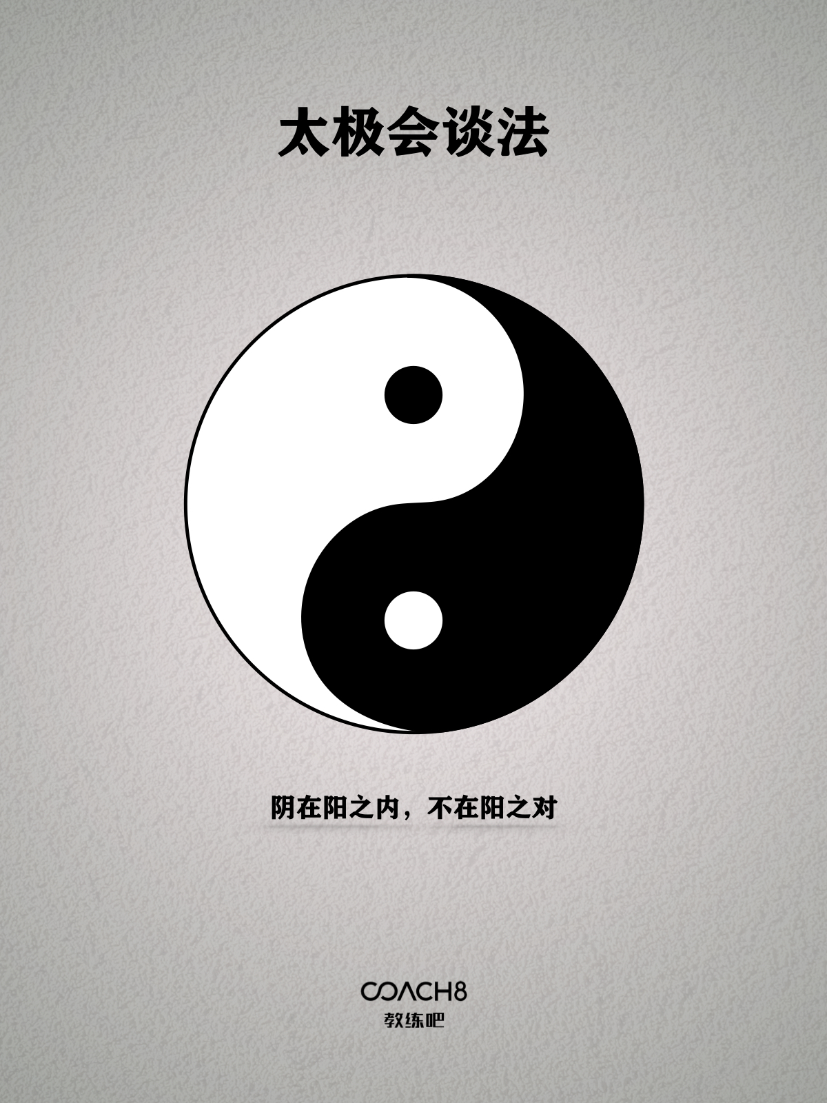 太极会谈法,是Coach8创始人薛铁鏻提出的一种在Coaching中的一种对话形式。借用了太极的主要思想,在和Coachee对话中,借力打力,以柔克刚及促进双方能量(“气”)的流动。