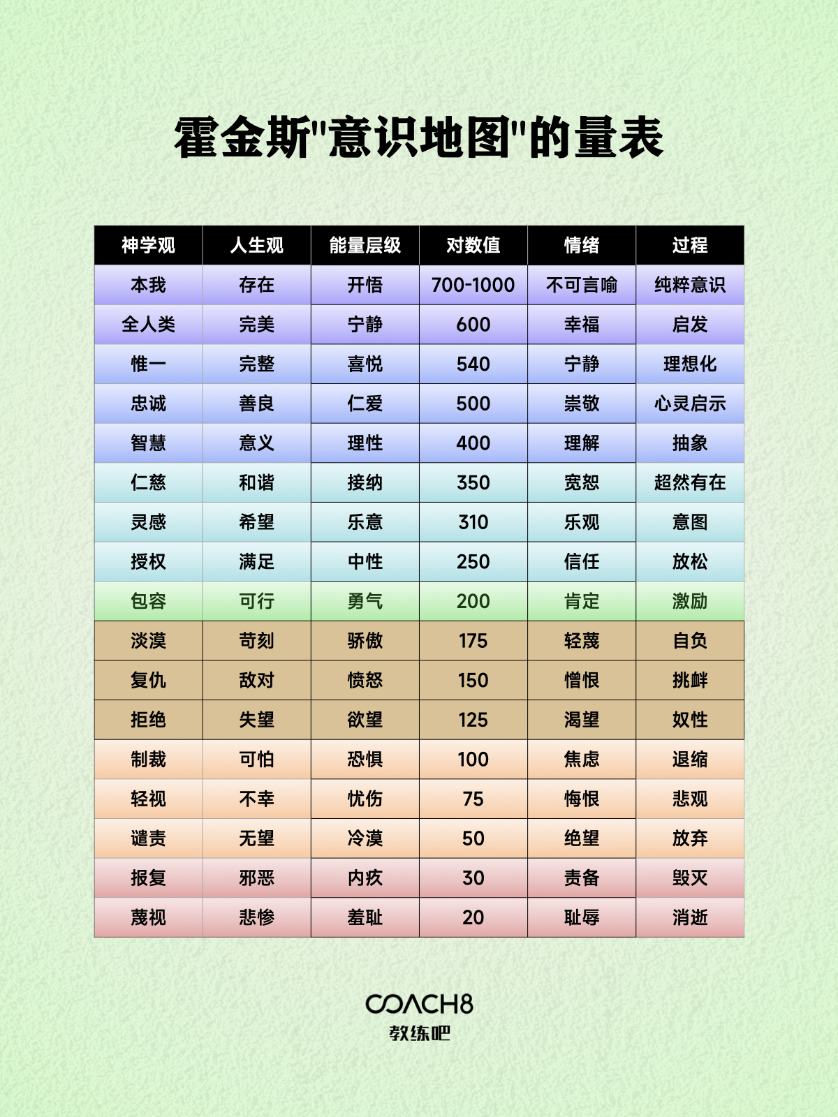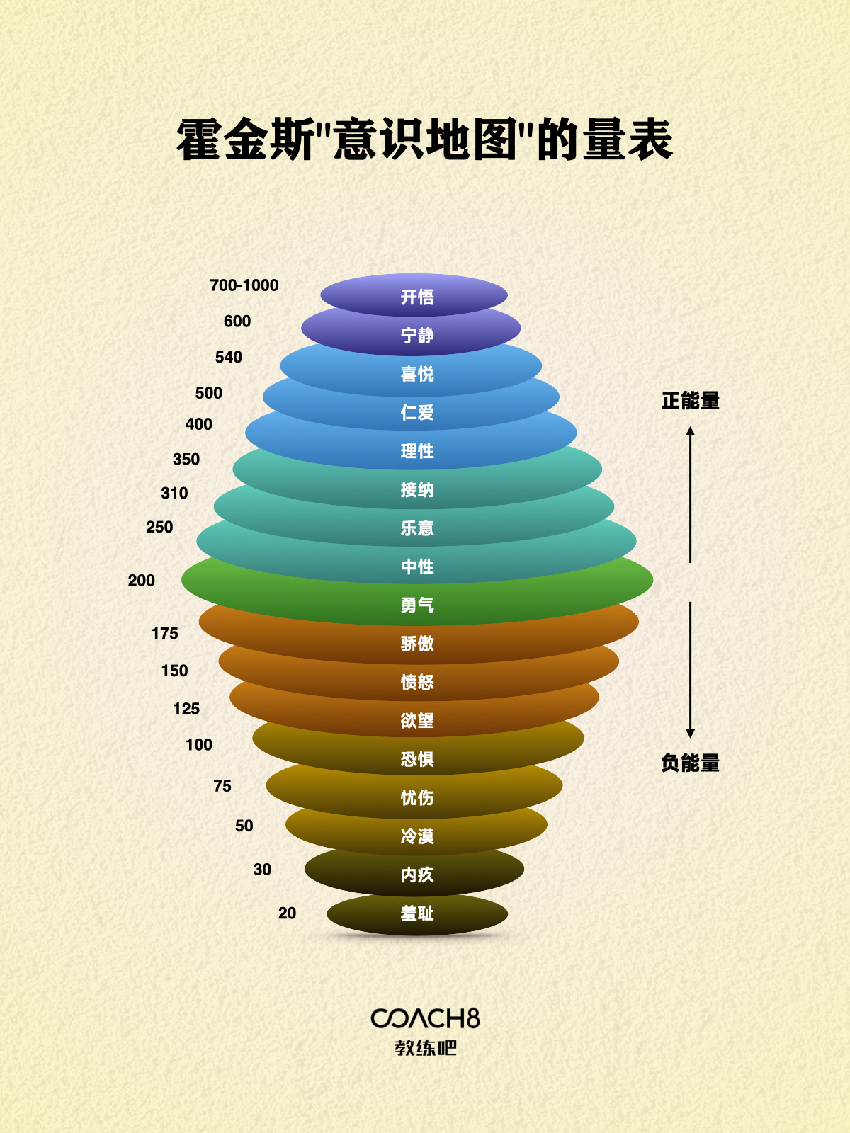 这个量表基于霍金斯的研究和观察,通过对人类思维、情绪和行为进行了广泛的观察和测量。它用来量化和描述意识的不同层次,从低级的欲望和情绪到更高级的爱、宽容和理解。