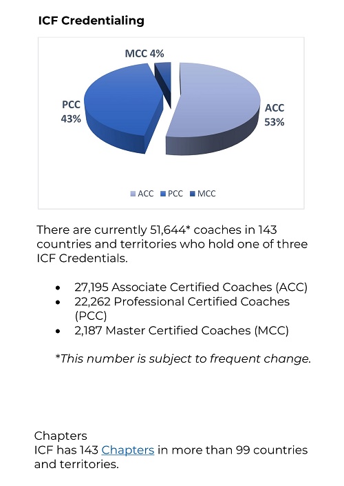 ICF将“教练”定义为与客户在发人深省和富有创造性的过程中进行合作,激发他们最大限度地发挥个人和专业潜力。 (以下数据都是截止到发稿日的统计,数量会随着日期的变化而发生变化)