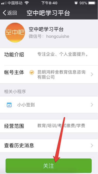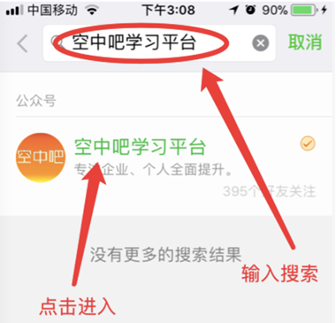 1、在微信“通讯录”的公众号 ,点右上 “+”,输 “空中吧学习 平台”搜索,搜索到之后点击进