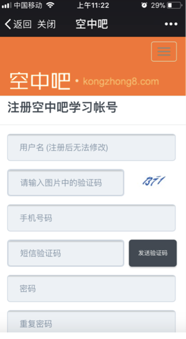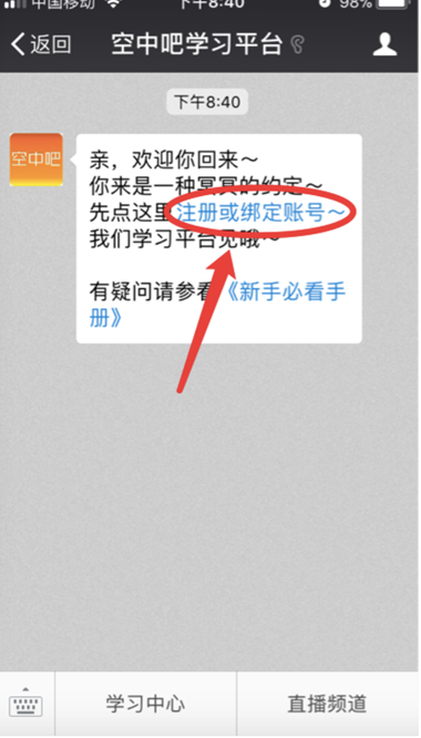 【空中吧】学习平台 是基于移动互联网设备和微信平台来进行学习的平台,所以首先先用手机微信关注公众号 “空中吧学习平台” ,然后点击平台界面底部的“ 学习中心 ”按钮,然后点击“进入学习中心”字样进入,第一次进入系统会提示注册,按照系统提示注册即可。