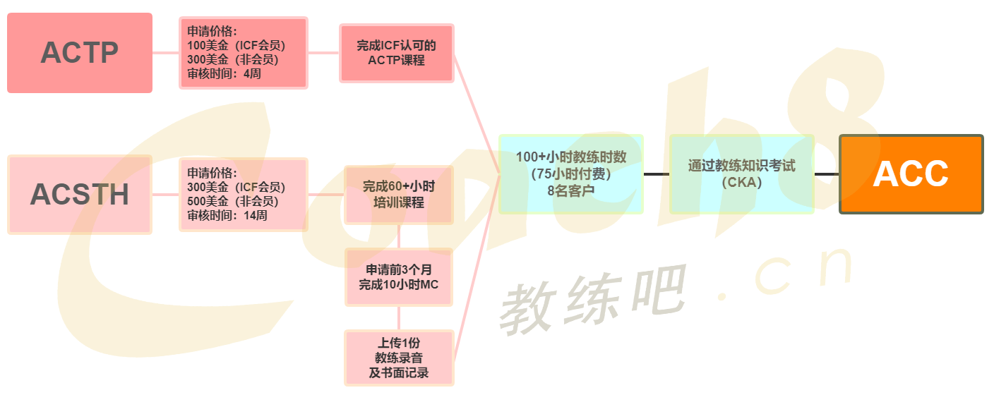 从下面两张申请ACC和PCC的流程图可以看出,相比ACSTH而言,学员通过ACTP申请ACC和PCC,价格更低、审核时间更短、MC时长和提交材料更少。