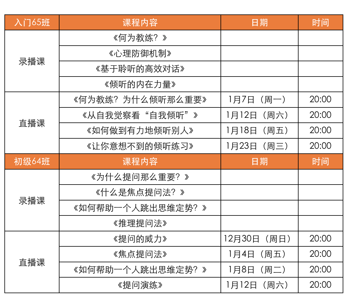 2019年1月入门、初级班课程时间安排表