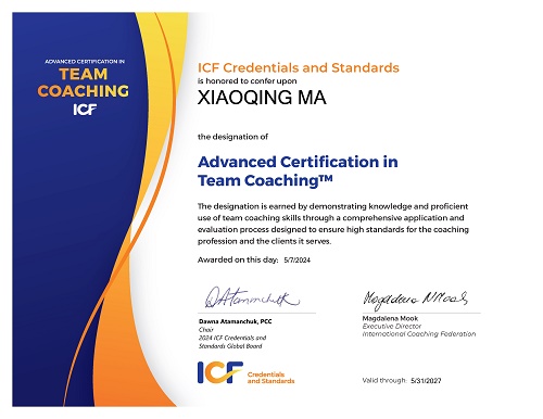 Coach8的资深教练导师麻晓晴老师,持有ICF认证教练证书十年有余。作为IAF国际引导者协会认证CPF专业引导师, “LSP认真玩引导”中国社群主理人暨英国SeriousWork独家授权L1&L2认证培训师,《乐高工作法实战手册》中国翻译者之一,麻晓晴老师通过了ICF的ACTC英文版考试,成为首批获得ICF团队教练证书的专业教练。