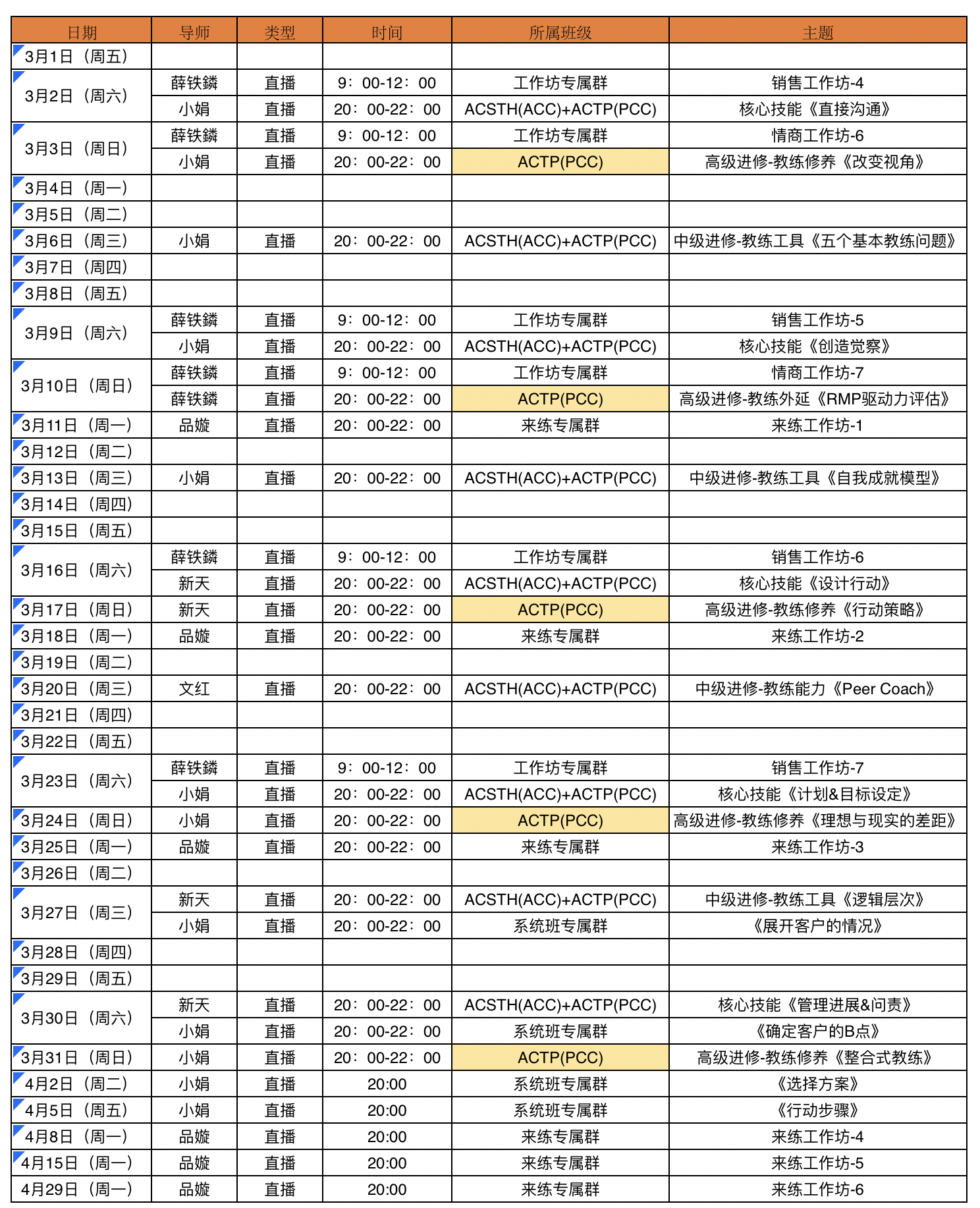 2019年3月高级进修、PCC认证班必修课程时间安排表