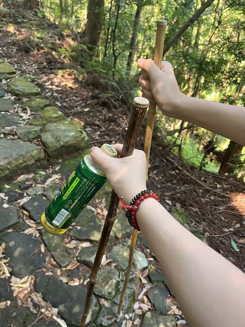 山路挺陡峭,起点甚至有为登山人提供的竹竿作为登山杖。我们各拾起一根,吭哧吭哧开始往上爬。中间聊到我在学教练,同伴说: