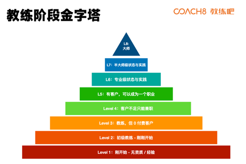 他分享了“教练阶段金字塔”,看到这个金字塔,就会让目标的到达有据可依,也让自己知道这是存在规律的。