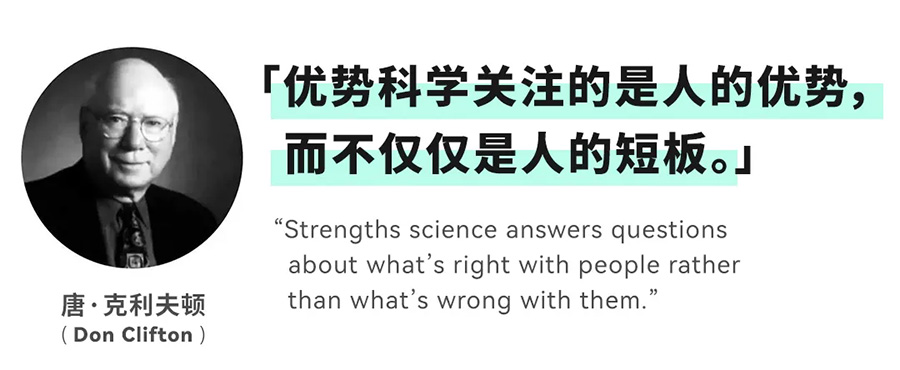 通常,心理学领域更侧重于减少个人痛苦的干预,但唐·克利夫顿(Don Clifton)看到了一个补充这项传统科学的机会:他提出的「优势科学」关注的是人的优势,而不仅仅是人的短板。