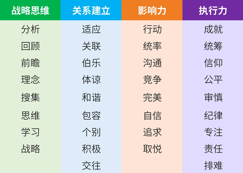 当克利夫顿研究人类行为时,他注意到了数以百计的积极特征,并看到这些特征有许多共同点。根据这些共性,他将它们提炼成我们今天所熟知的:分为四大维度(战略思维、关系建立、影响力和执行力)的34项才干主题。
