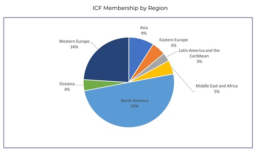 ICF在160个国家和地区拥有58205个会员,在99个国家和地区拥有超过142个分会。