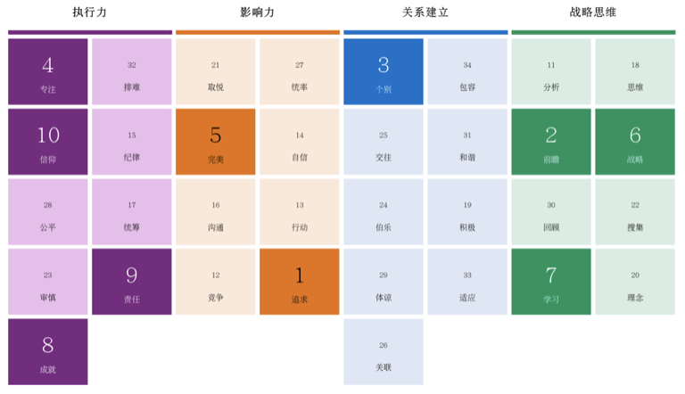 34项才干以排序的方式呈现,每个人的强弱项清晰呈现。