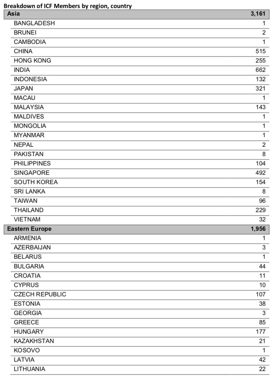 成立于1995,国际教练联合会(ICF)是全球领先的组织,致力于通过制定高标准,提供独立的认证,并建立一个世界范围的证书教练教练网络。ICF寻求推进专业教练的艺术、科学和实践。ICF将教练定义为与客户合作的一个发人深省和创造性的过程,激励他们最大化他们的个人和专业潜力。(以下数据都是截止到发稿日的统计,数量会随着日期的变化而发生变化)