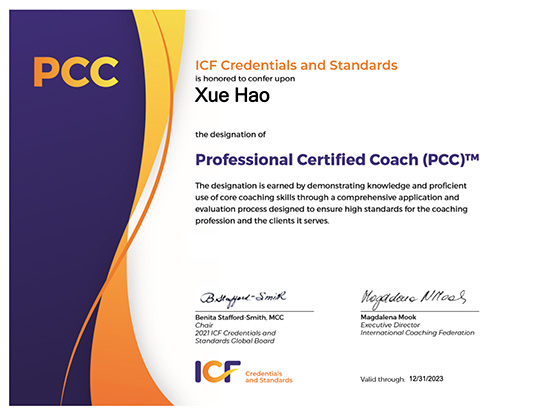 我是一名ICF国际教练组织认证的PCC教练。