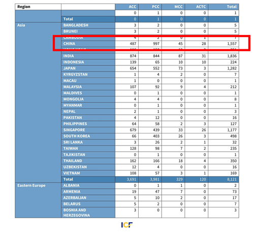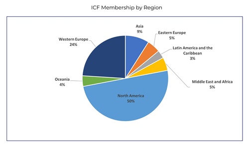 ICF在159个国家和地区拥有58659个会员,在99个国家和地区拥有超过141个分会。
