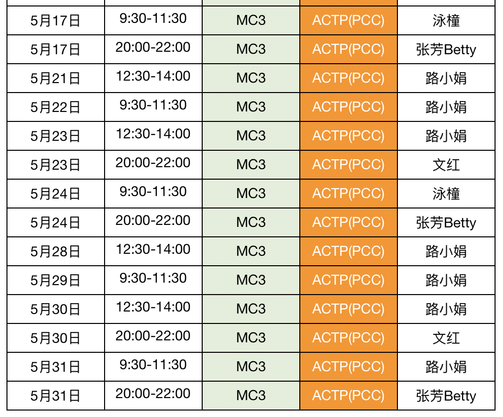 2019年5月MC3及MC(加场)课程时间安排表(ACTP专用)