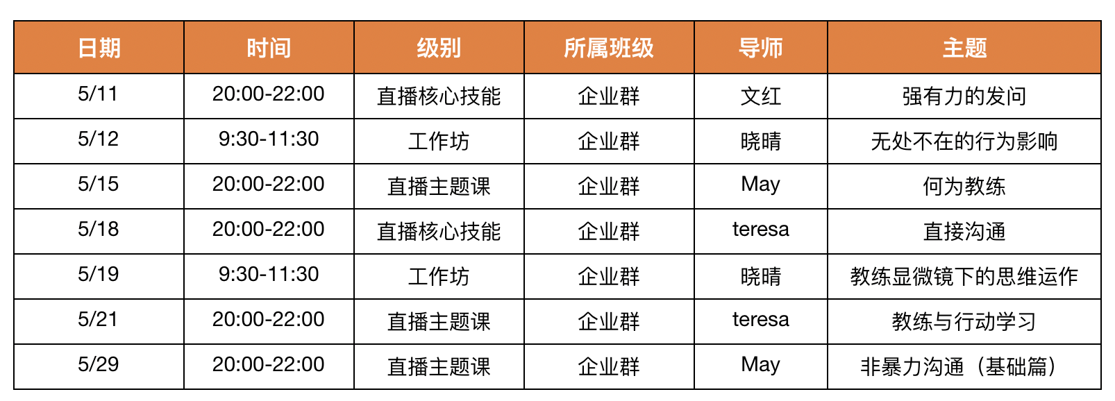 2019年5月Coach8企业教练课程时间安排表