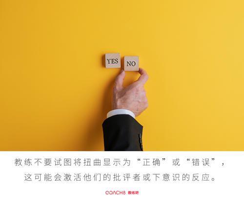 重要的是,教练不要试图将扭曲显示为“正确”或“错误”,因为这可能会激活他们的批评者或下意识的反应。相反,帮助您的客户看到还有其他方式,可以更好地为他们支持。