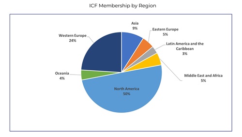ICF在159个国家和地区拥有59047个会员,在99个国家和地区拥有超过141个分会。