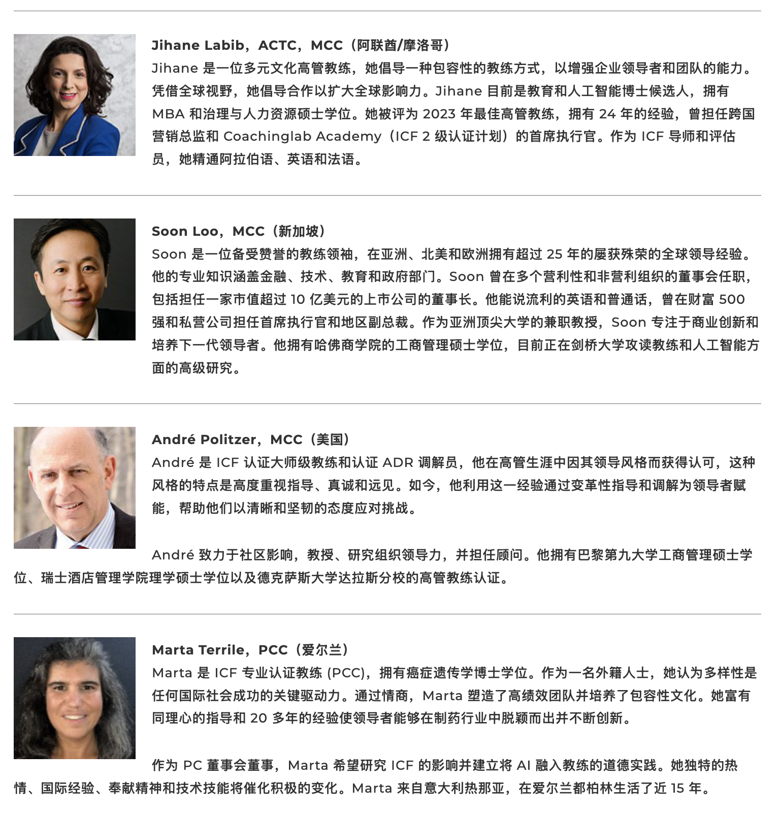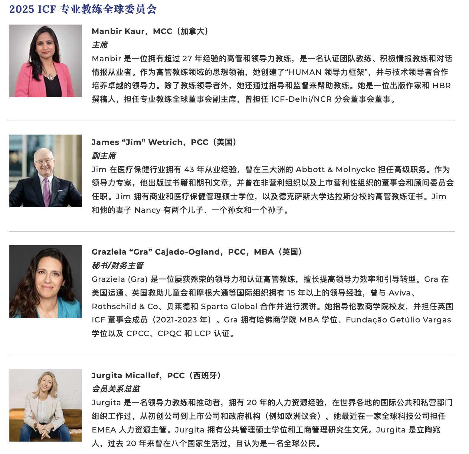 ICF 专业教练董事会由以下成员组成: