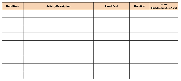 然后,在方便的时候,返回您的活动日志并记下每个活动的持续时间,以及它是高,中,低或无值任务。(根据它对实现工作目标的贡献来评估这一点。)