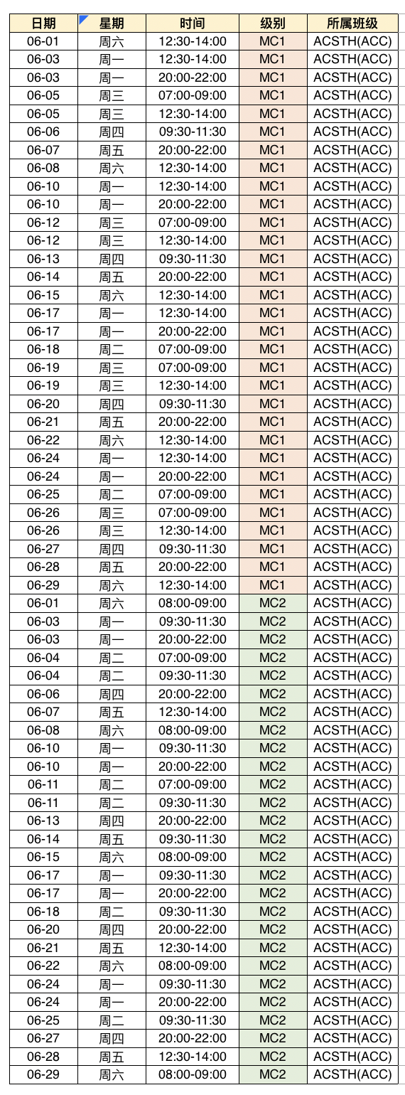 2019年6月MC1、MC2课程时间安排表(ACSTH专用)