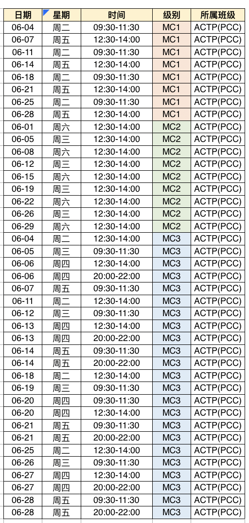 2019年6月MC3及MC(加场)课程时间安排表(ACTP专用)