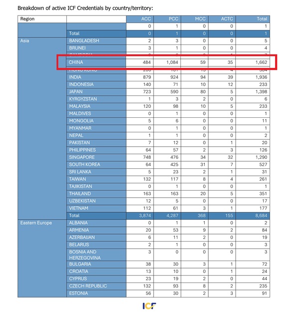截止2025年2月8日,ICF统计中国大陆地区教练持证人数为1662人,香港地区384人,台湾地区261人。