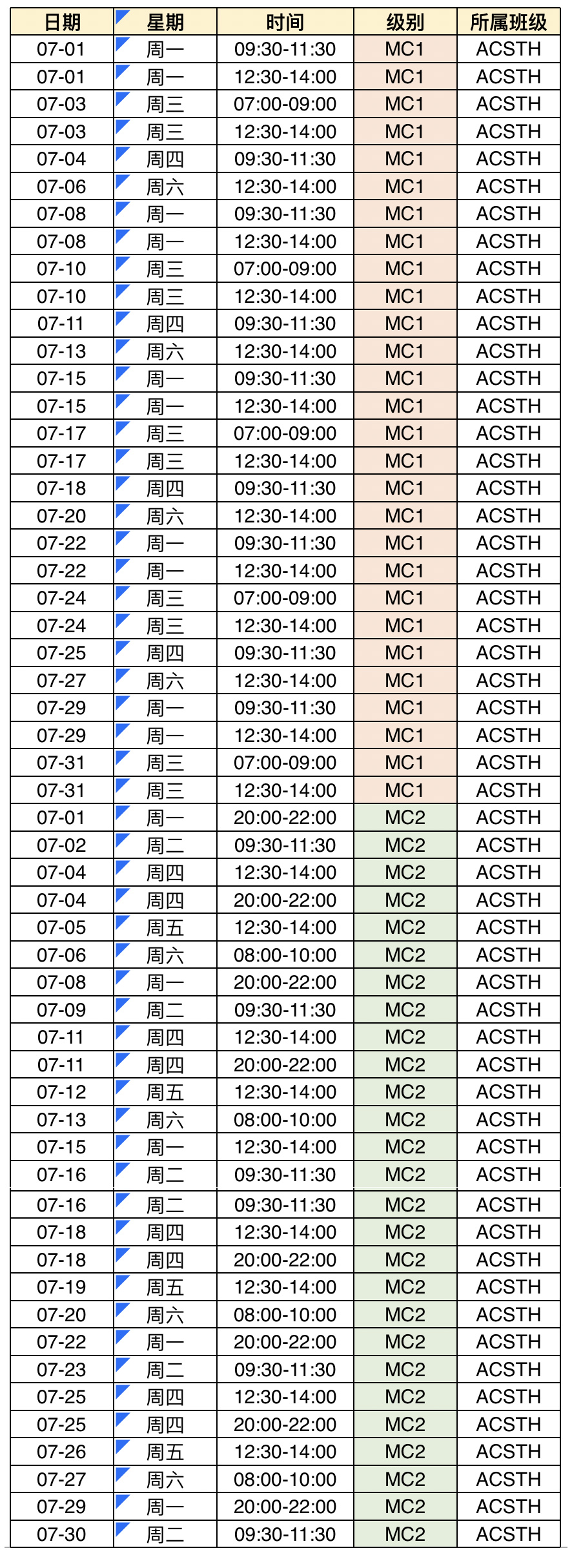 2019年7月MC1、MC2课程时间安排表(ACSTH专用)