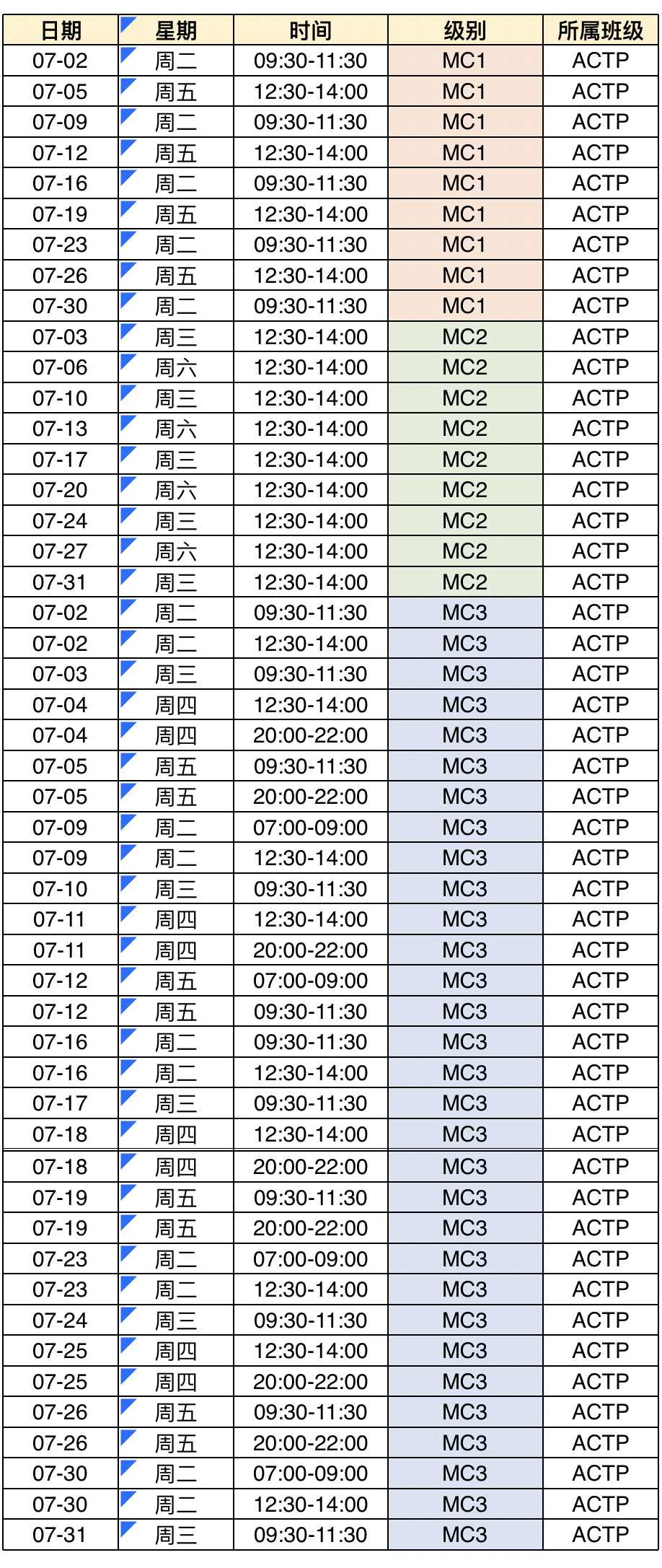 2019年7月MC3及MC(加场)课程时间安排表(ACTP专用)
