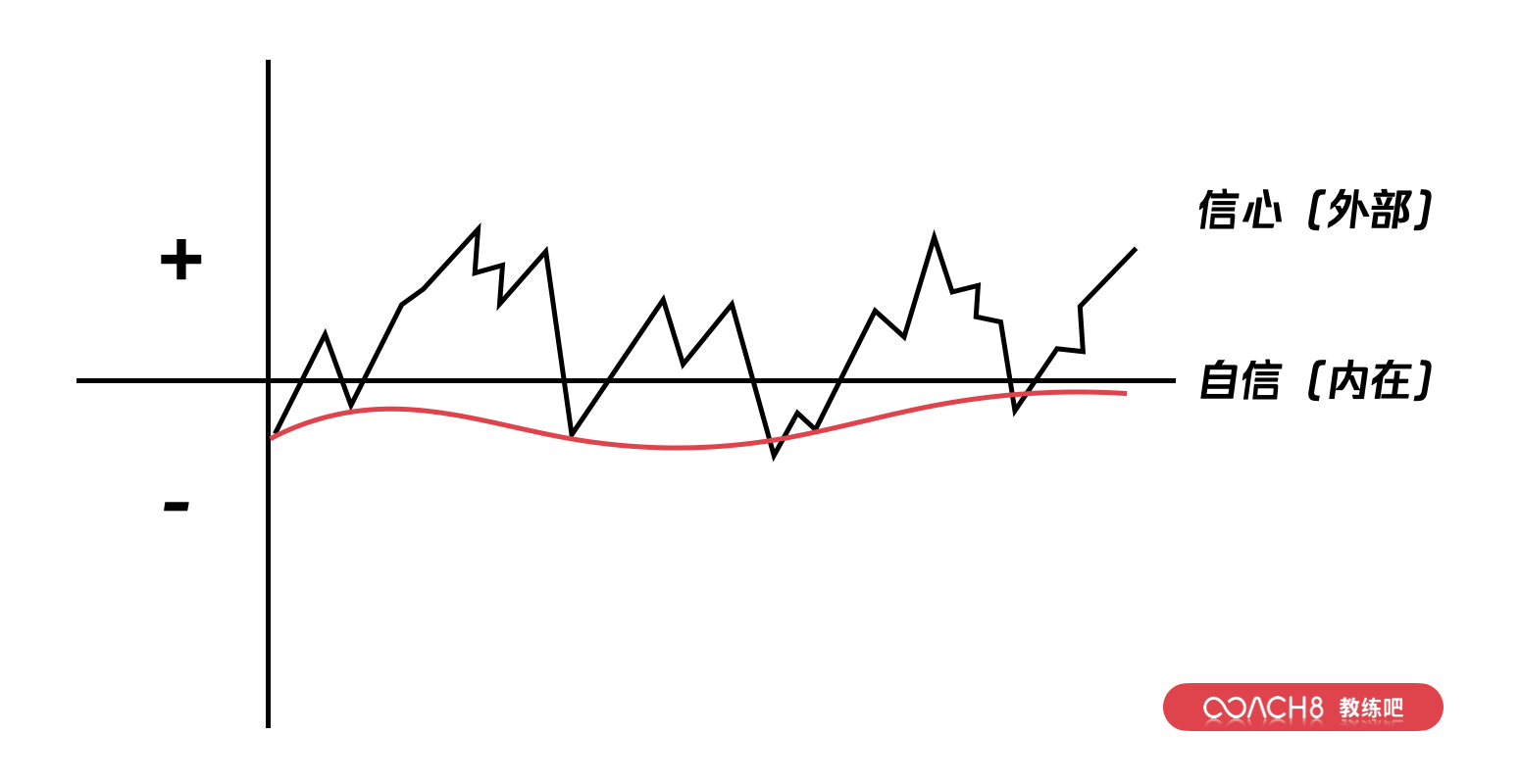 成功来自于信心的综合水平,所以理解信心和自我信心如何共同作用很重要。信心水平由外部因素决定,因此它会根据外部发生的事情自然地上下波动。这是自然的。自我信心水平由内部感受决定,不受外部因素影响。波动的信心建立在自我信心的基础之上,将其作为一个基础或平台:自我信心基础越高越强,能够达到的信心水平就越高。
