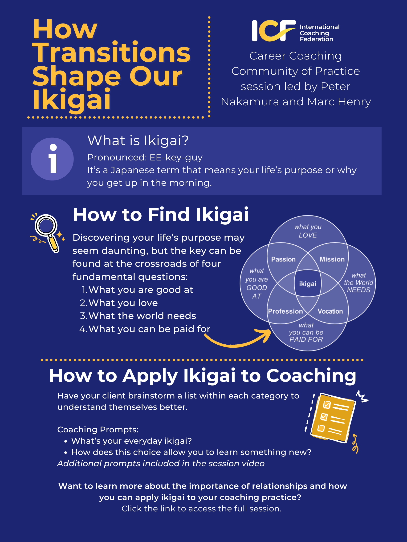职业教练实践社区:转变如何塑造我们的 “生命意义”。 在这个预先录制的会议中,Peter Nakamura 和 Marc Henry 分享了他们对人生转变及其对客户生命意义或“存在理由”的影响的见解。他们将向您展示这些见解如何应用于职业教练,以便您可以在教练实践中使用这些概念来实现有目的的转变。