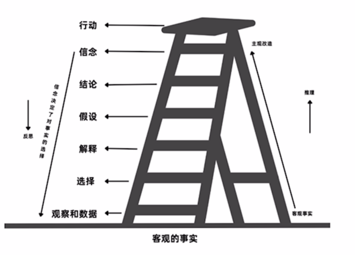 推理梯子展示了人们如何从观察事实到采取行动的思维过程,包括七个阶梯: