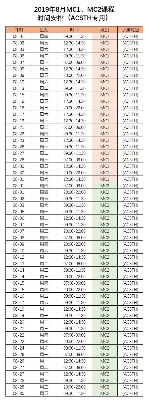 2019年8月MC1、MC2课程时间安排表(ACSTH专用)