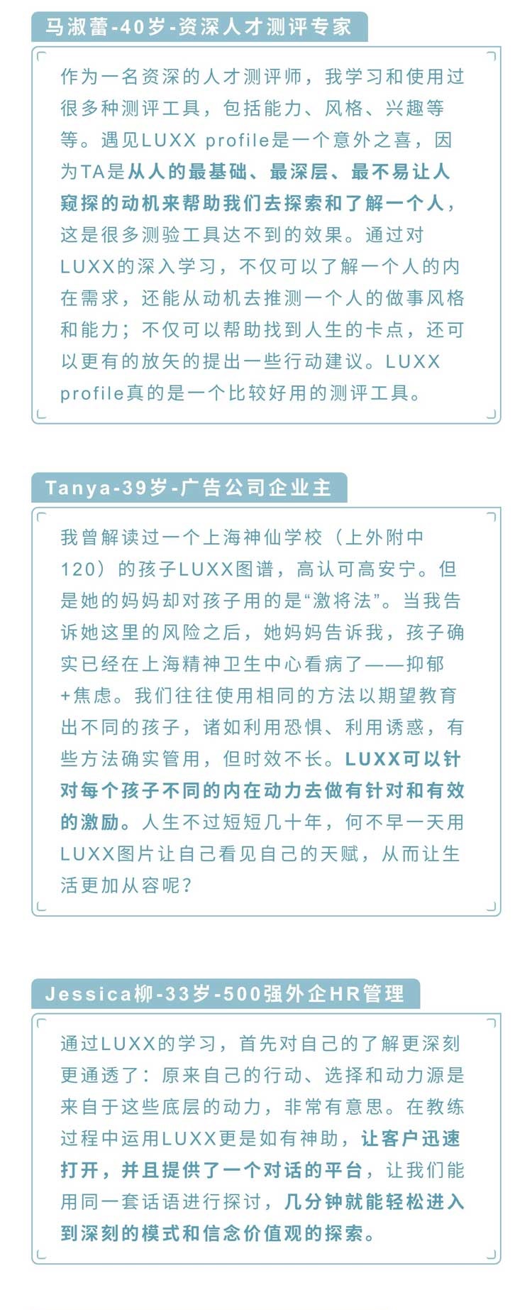 为了确保评估品质,仅由经过认证的LUXXprofile认证分析师获取LUXXprofile评估报告及专业咨询。